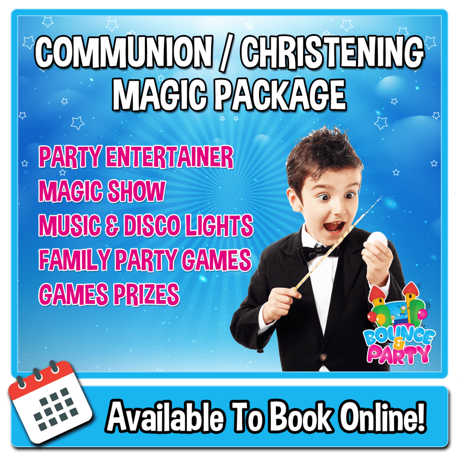 Take a look at our fantastic Magic Communion Party Package from Bounce & Party Glasgow. If your looking for something a little different but still want the traditional aspects of a party, our Magic Communion party package could be the answer you are looking for. Your Bounce & Party Host will bring you a mix of magic, music & disco lights, party games with prizes and will ensure everything is organised with fun and laughter throughout.