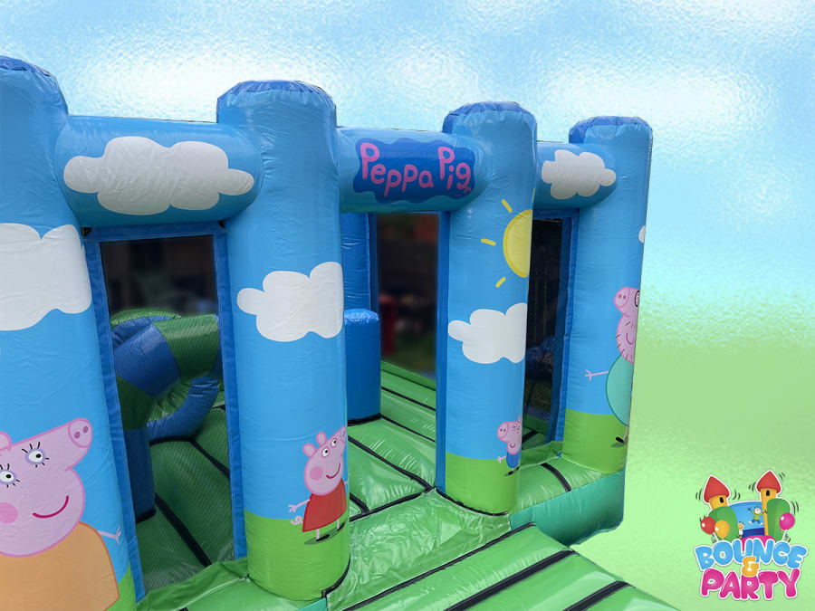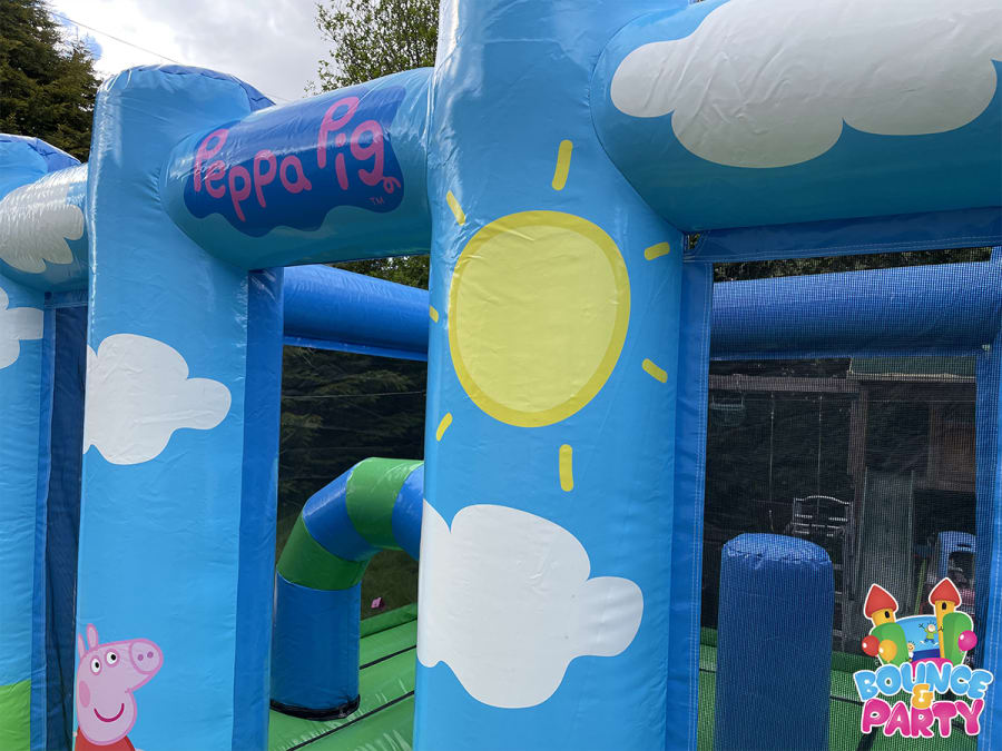 This activity bouncy castle stands at just 9ft high, the Peppa Pig activity bouncy castle can be used indoors within a venue or outdoors in your garden. This activity bouncy castle features a large 10ft by 14ft play area and features a mix of obstacles.
