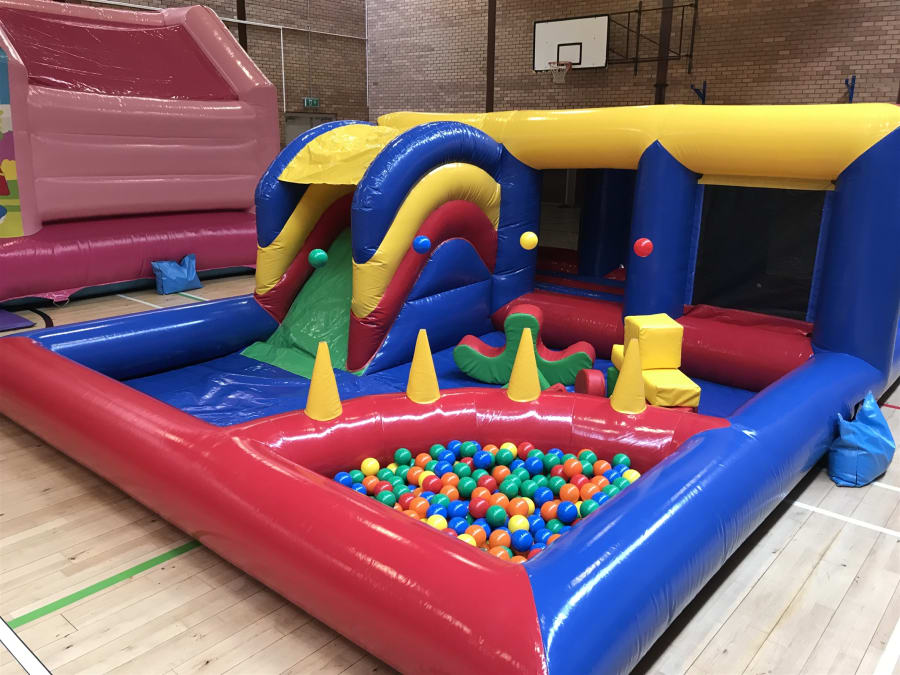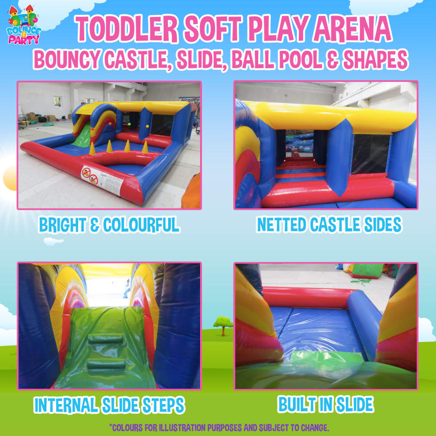 - Arena includes: Bouncy Castle, Slide, Ball Pool with Multi Colour Balls, Multi Colour Soft Play Shapes