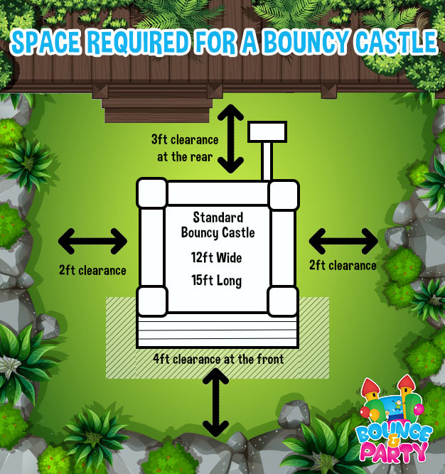 The most common size for a bouncy castle is 12ft by 12ft or 12ft by 15ft but this is the size of the bouncy castle not the size of area that the bouncy castle requires. You will need extra space for the fan, blower tube, Safety mats, impact area, anchor pegs, etc...
